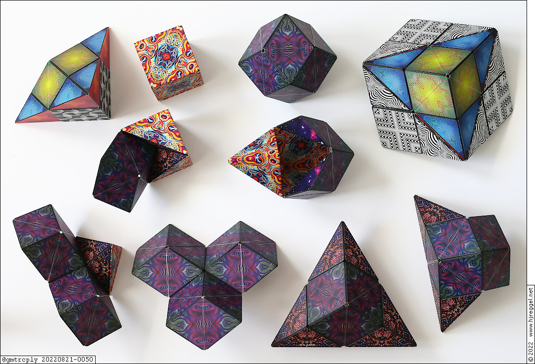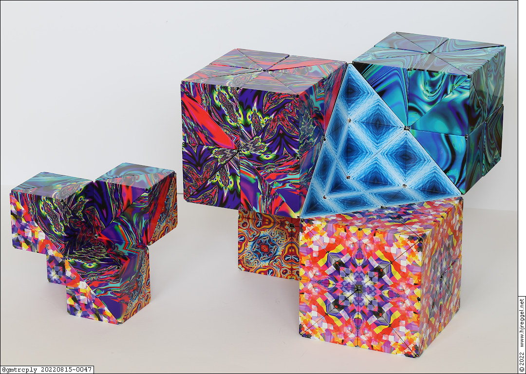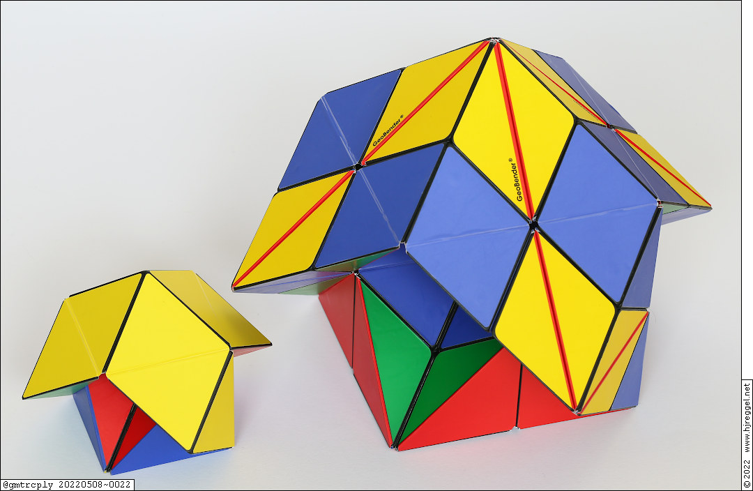Upsizing is a common challenge with 2D- and 3D-tilings. This can be done with ShaShiBo and GeoBender as well. For double-sizing a single shape, you need eight units. But it can be helpful to have a ninth as "live" model.