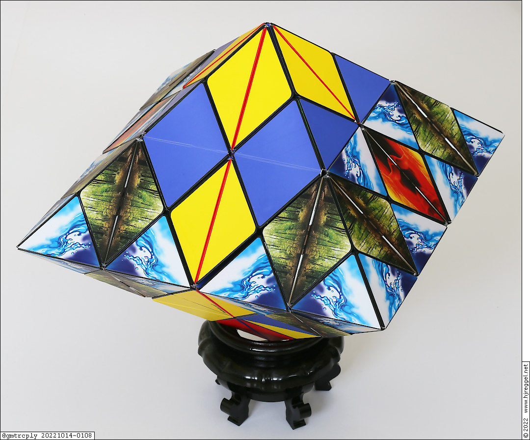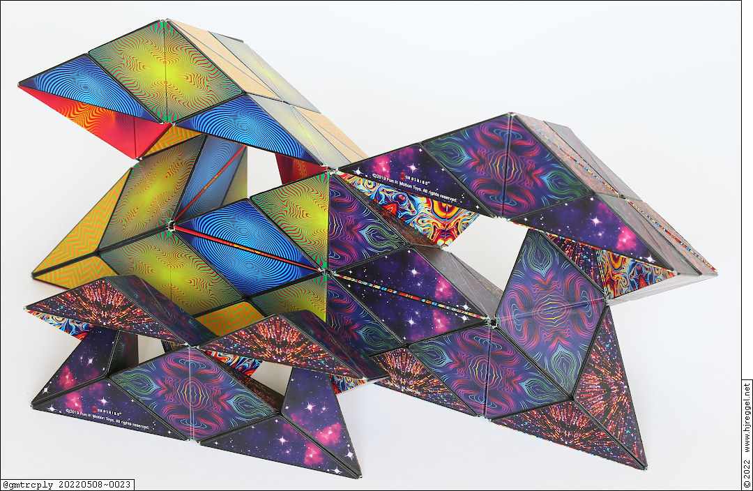 The base shape is made from four UFO shapes. The double-sized shape looks very impressive, but is actually one of the easy double-sizing jobs. The central element is simply made from four "Seashell" combos, the four Cube ends connected to the central element are mande from three "Diamond" combos each.